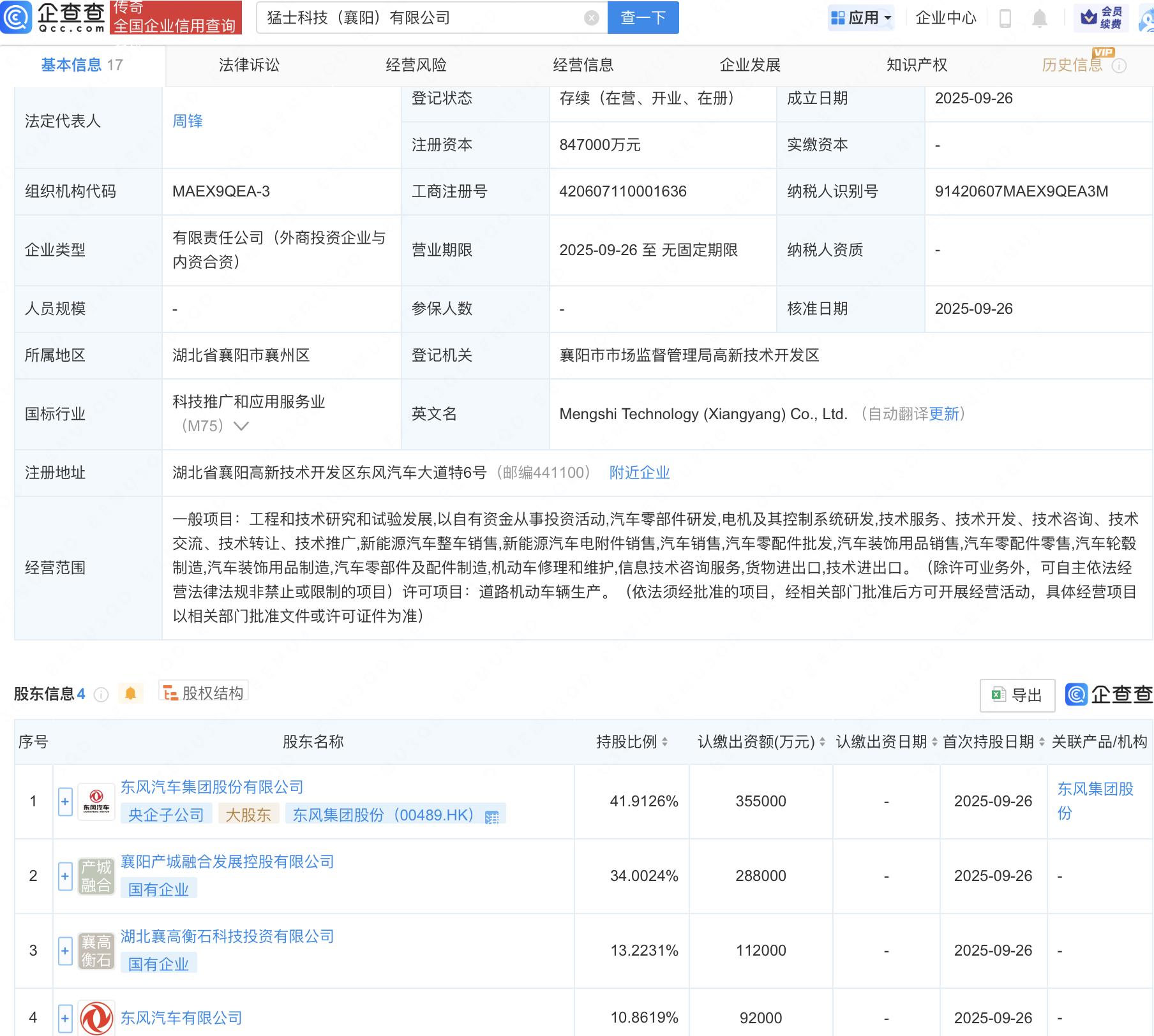 近日,猛士科技(襄阳)有限公司成立,注册资本84.7亿元,经营范围包含:工程和技术研究和试验发展;以自有资金从事投资活动;汽车零部件研发;电机及其控制系统研发等。企查查股权穿透显示乐天盈配资,该公司由东风集团股份(00489.HK)、东风汽车有限公司等共同持股。