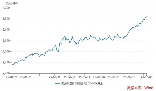 9 月 23 日,COMEX 黄金期货价格首次突破 3800 美元 / 盎司,不断刷新历史新高。进入 10 月,国内假期期间,金价再上两个台阶,10 月 1 日盘中站上 3900 美元 / 盎司,一周时间内,金价站上 4000 美元 / 盎司的历史高位。