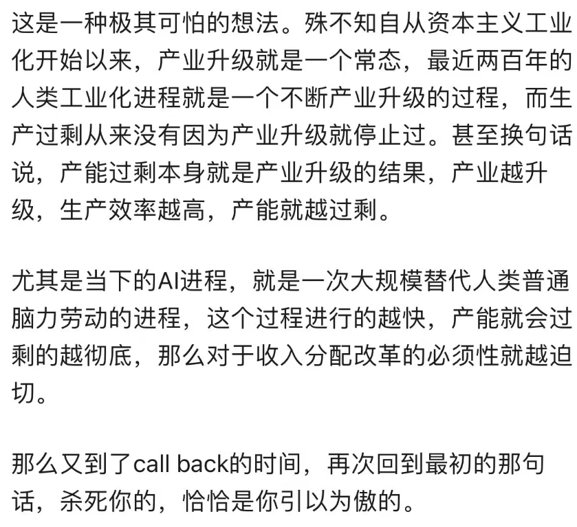 要是这个问题不解决,我觉得光付行业所发生的事情,将同样发生在其他行业中,不管它处于哪个发展阶段,都不会让参与其中的大多数人感受到分配满足感,以及由此带来的消费可能性。