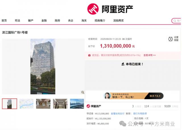 据阿里资产拍卖平台,近日慧仁策略,阳光城总部滨江国际广场 1 号楼拍卖成交。本次拍卖起始价为 11.3 亿元,此次拍卖经过 37 轮竞拍,最终成交价格为 13.1 亿元。