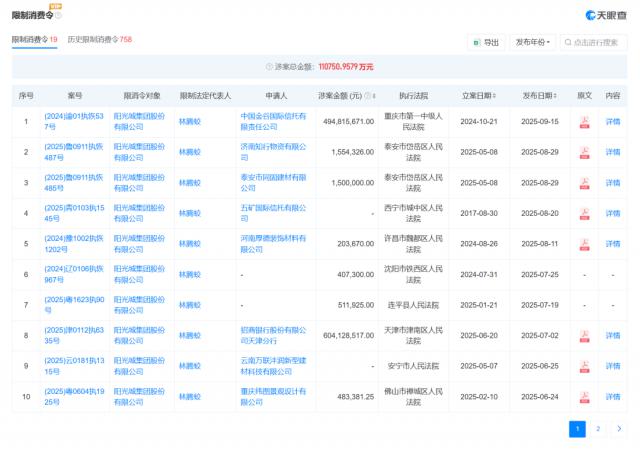 2024 年 3 月,阳光城创始人、福建百亿富豪林腾蛟卸任法定代表人、董事长,朱荣斌卸任总经理,由施志敏担任法定代表人、董事长、总经理。同时,公司董事、监事均发生变更。林腾蛟曾以 170 亿元的身家位列《2020 胡润全球房地产富豪榜》第 119 位,如今已被限制高消费,名下目前仍有 19 条限消令,涉案总金额超过 10 亿元。