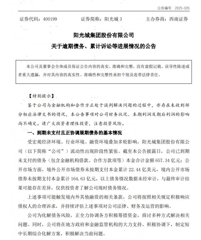 据阳光城公告,截至今年 9 月 25 日,阳光城已到期未支付的债务(包含金融机构借款、合作方款项等)本金合计金额 657.34 亿元;公开市场方面,境外公开市场债券未按期支付本金累计 22.44 亿美元,境内公开市场债券未按期支付本金累计 164.63 亿元。