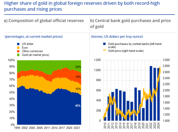 欧央行发布《欧元的国际地位》报告,其中提到:在黄金价格和购买量处于历史高位的背景下华星配资,到2024年底,黄金在各国官方储备总额中的份额增加到20%,超过了欧元的份额(约为16%)。报告中还提到,新兴经济体和发展中经济体的中央银行是黄金购买的主力。