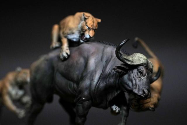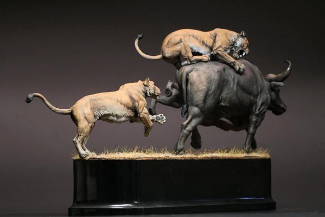 这阵骚动惊动了正在饮水的野牛群。而在牛群侧翼,三只雌狮默契地伏低身躯,金黄色的皮毛紧贴地面。年长的母狮率先发起冲锋,精准地扑向一头落单的野牛后腿;年轻的母狮随即包抄,利爪深深嵌入野牛皮革般坚韧的皮肤。野牛发出愤怒的咆哮,扭动千斤重的身躯试图甩开猎手,扬起的尘土在阳光下形成金色的雾霭。